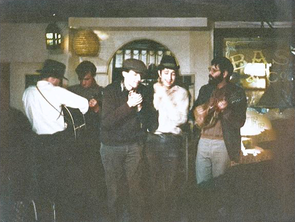 这应该是拍摄于1963年元旦夜的一张照片,从右向左分别是:Eric Von Schmidt, Bob Dylan和Richard Farina。而后排正脸的很像是Martin Carthy。没错这是在英国,迪伦首次访英,碰巧遇到熟人……迪伦这不到一个月的时间非常重要,不仅是很多歌曲的源头,也是独立思考的创作肇始。(详见《揭秘铃鼓先生:鲍勃·迪伦评传》)